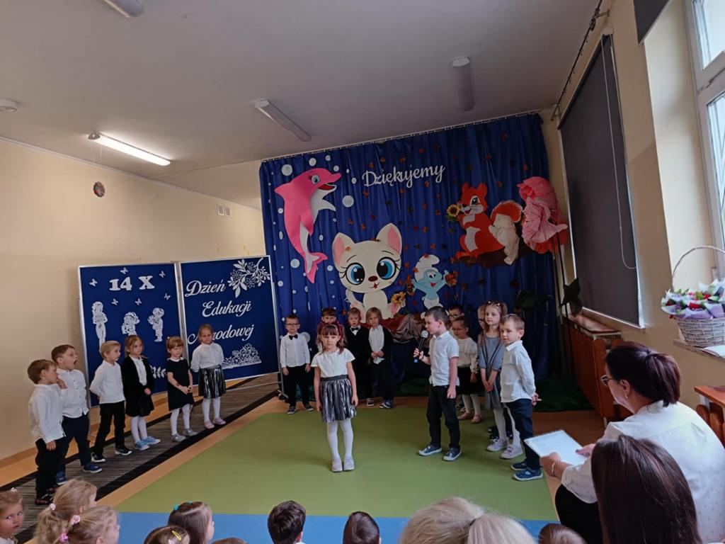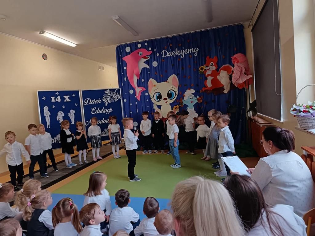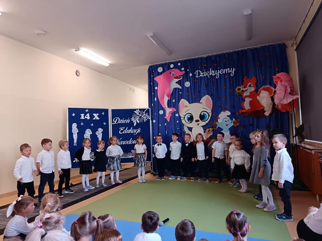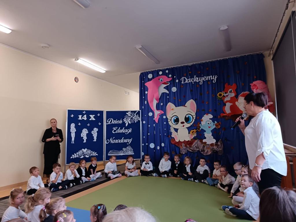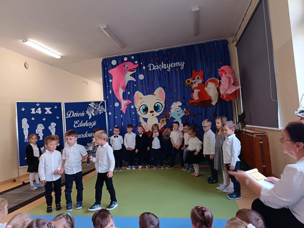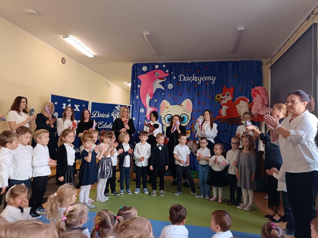 15 października w naszym przedszkolu odbyło się uroczyste przedstawienie przygotowane przez dzieci z grup 5-latków „Smerfy” i „Kotki”. Z okazji Dnia Edukacji Narodowej przedszkolaki zaprezentowały piękny program artystyczny – śpiewały piosenki i recytowały wiersze. Pani Dyrektor Grażyna Leydy pogratulowała małym artystom wspaniałego występu oraz złożyła życzenia wszystkim nauczycielom i pracownikom z okazji ich święta.