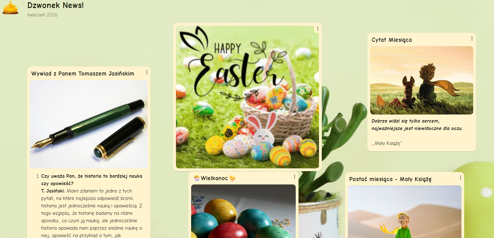 Wydarzenia szkolne„Kwietniowy Dzwonek News!” Zapraszamy do zapoznania się z kwietniowym wydaniem gazetki ,,Dzwonek News!”. W tym numerze m.in. wywiad z panem Tomaszem Jasińskim. Miłej lektury!