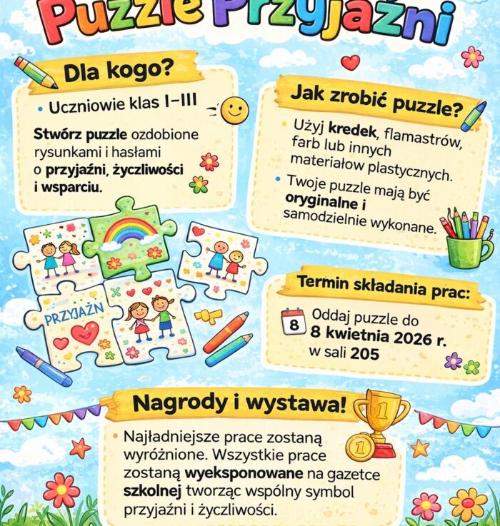 Marcowe wydanie gazetki ,,Dzwonek News!” Zapraszamy do lektury marcowego wydania gazetki ,,Dzwonek News!''. W tym numerze znajdziecie m.in. wywiad z panią 16 marca 2026 / czytaj więcej Konkurs dla klas I-III Zapraszamy uczniów klas I-III do konkursu z okazji Dnia Świadomości Autyzmu. Organizatorzy: Monika Frydrychiewicz, Marzena 16 marca 2026 / czytaj więcej Uwaga konkurs Zapraszamy uczniów klas 4-8 do konkursu na projekt graficzny logo z okazji Dnia Świadomości 16 marca 2026 / czytaj więcej Tydzień Projektowy jako dobra praktyka – doświadczenia SP 12 – inspirujące spotkanie o reformie Kompas Jutra 26 W czwartek, w Szkole Podstawowej nr 2 im. Jana Pawła II w Węgrowie, odbyło się 12 marca 2026 / czytaj więcej Od wymarzonego przyjaciela do europejskiej podróży – podsumowanie projektu eTwinning W klasie patronackiej Krajowego Biura eTwinning odbyło się spotkanie online podsumowujące dwujęzyczny projekt „Unser Traumfreund / 11 marca 2026 / czytaj więcej 5 miejsce w Międzypowiatowych Igrzyskach Młodzieży szkolnej w koszykówce chłopców 6.03.2026r. w SP1 Mińsk Mazowiecki spotkało się osiem najlepszych zespołów w regionie w koszykówce chłopców kat. 6 marca 2026 / czytaj więcej 🇬🇧 Wielka Brytania od kuchni 🫖 Piątek po południu to start weekendu w kulturze brytyjskiej. Zaś w naszej szkole dziś rozpoczęliśmy bliskie 6 marca 2026 / czytaj więcej EUROPEJSKI DZIEŃ LOGOPEDY Z okazji Europejskiego Dnia Logopedy, który obchodzony jest 6 marca, w naszej szkole odbyły się 6 marca 2026 / czytaj więcej Dzień Otwarty dla przyszłych pierwszoklasistów Drodzy Rodzice! Kochane Dzieci! Serdecznie zapraszamy na Dzień Otwarty w Szkole Podstawowej nr 12 im. Kornela 2 marca 2026 / czytaj więcej 1 marca – Narodowy Dzień Pamięci Żołnierzy Wyklętych 1 marca obchodzimy Narodowy Dzień Pamięci Żołnierzy Wyklętych. Święto to zostało ustanowione 15 lat temu, 1 marca 2026 / czytaj więcej Emocje jak w teleturnieju Turniej wiedzy „Życie i twórczość Kornela Makuszyńskiego” w formule „1 z 10” Dużo emocji, szybkie 27 lutego 2026 / czytaj więcej Podziękowania z misji w Tandrano za okazane wsparcie Nasi przyjaciele z objętej patronatem naszej szkoły misji Misja św. Teresy od Dzieciątka Jezus w Tandrano 26 lutego 2026 / czytaj więcej < 1 2 3 4 5 … 19 >
