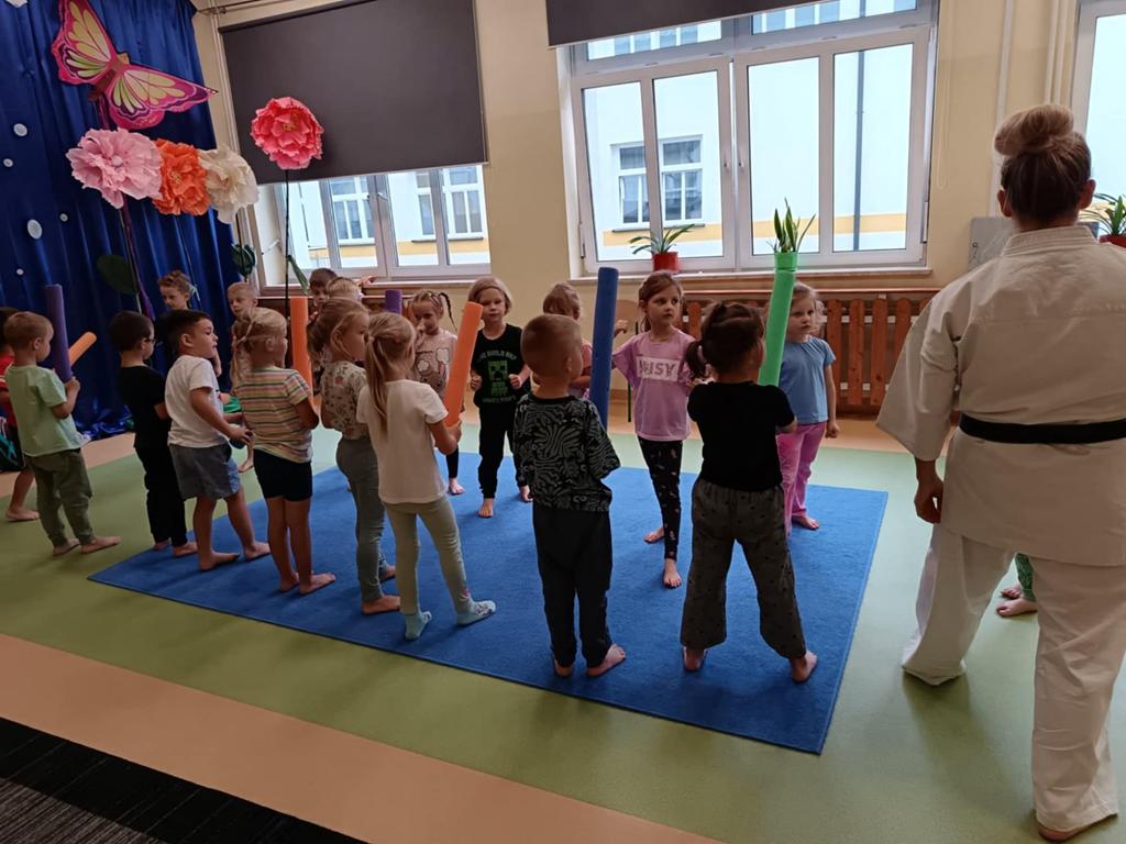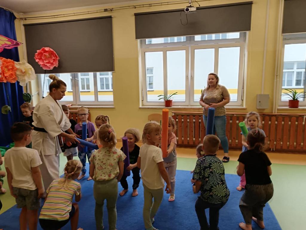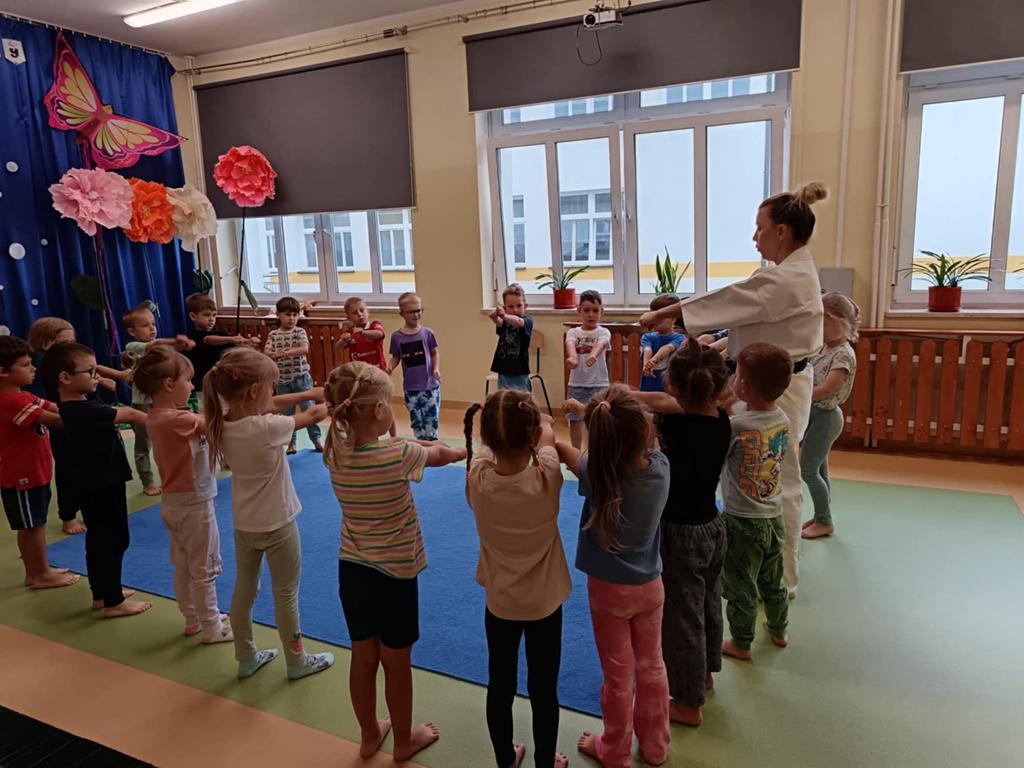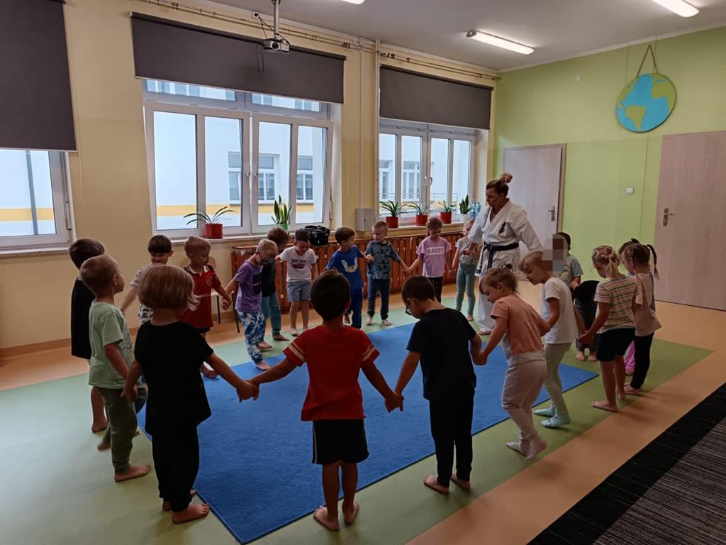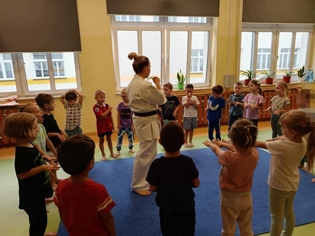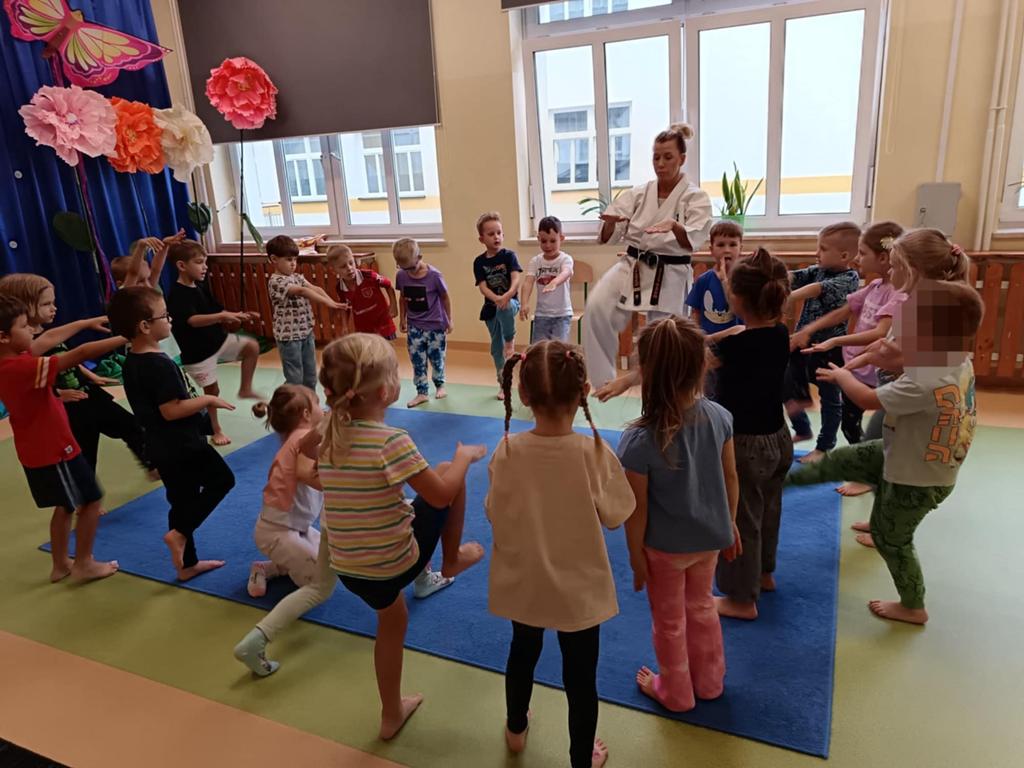 Dnia 11 września 2025 r. dzieci z grupy 5 latków SMERFY wzięły udział w wyjątkowych zajęciach ruchowych – Treningu Karate dla Przedszkolaków. Zajęcia miały formę 45-minutowego treningu dostosowanego do wieku dzieci. Podczas spotkania przedszkolaki uczestniczyły w zabawach i ćwiczeniach rozwijających sprawność, koncentrację i współpracę, poznały elementy karate uczące szacunku i samodyscypliny, a także z radością wzięły udział we wspólnym „kiai!”. Wydarzenie odbyło się w ramach akcji charytatywnej – cały dochód z licytacji został przeznaczony na leczenie Tymka Kalaty.