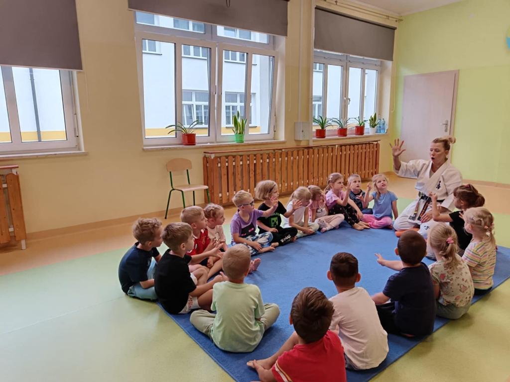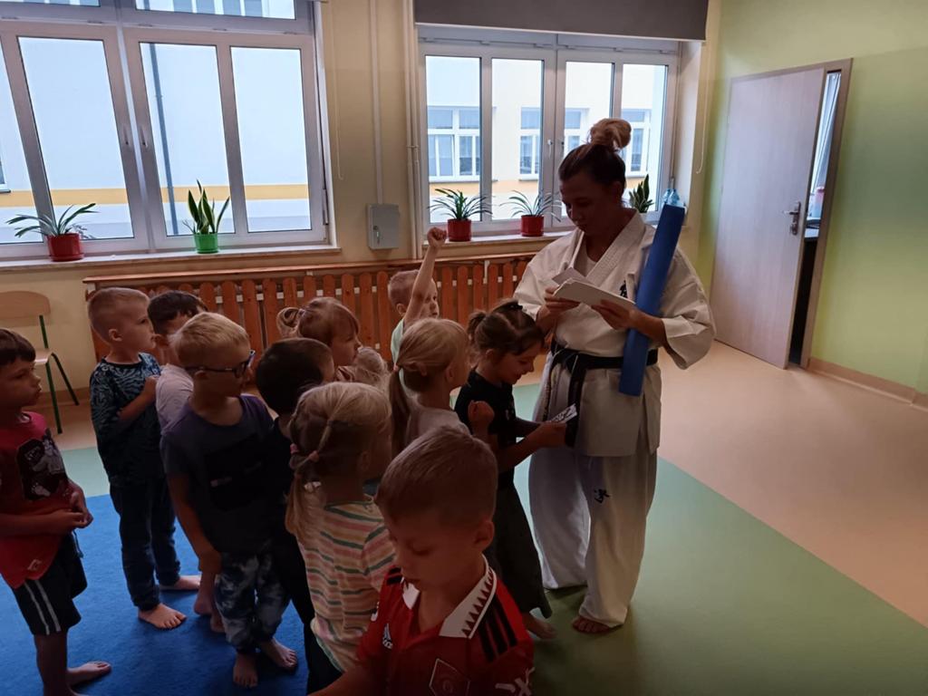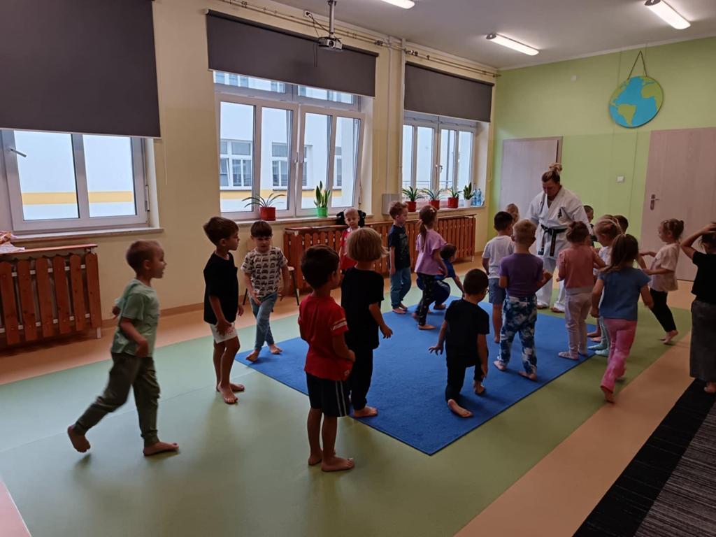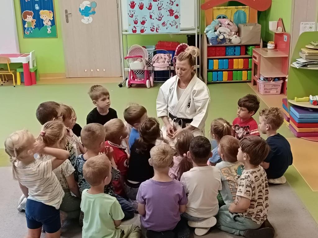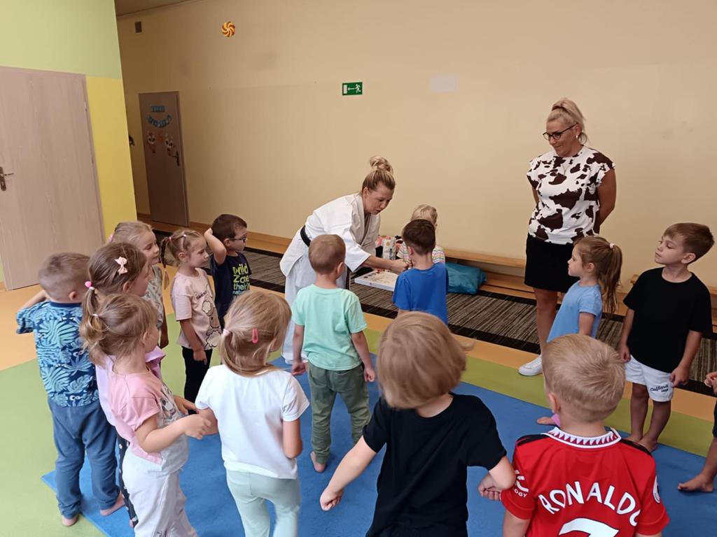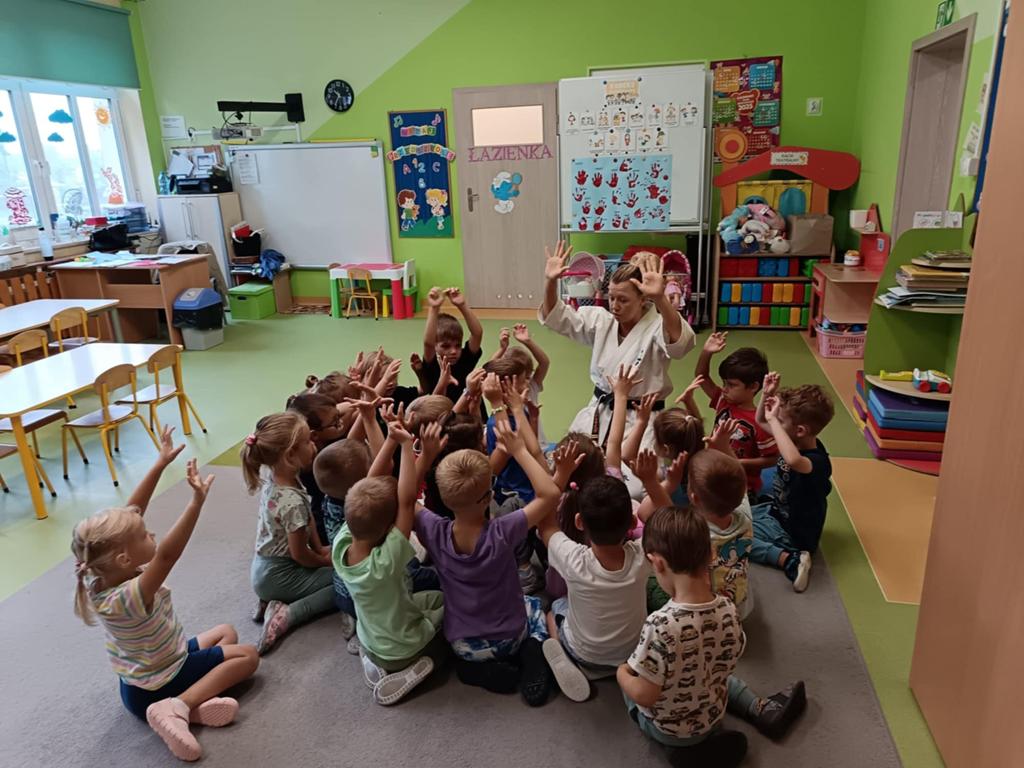 Dnia 11 września 2025 r. dzieci z grupy 5 latków SMERFY wzięły udział w wyjątkowych zajęciach ruchowych – Treningu Karate dla Przedszkolaków. Zajęcia miały formę 45-minutowego treningu dostosowanego do wieku dzieci. Podczas spotkania przedszkolaki uczestniczyły w zabawach i ćwiczeniach rozwijających sprawność, koncentrację i współpracę, poznały elementy karate uczące szacunku i samodyscypliny, a także z radością wzięły udział we wspólnym „kiai!”. Wydarzenie odbyło się w ramach akcji charytatywnej – cały dochód z licytacji został przeznaczony na leczenie Tymka Kalaty.