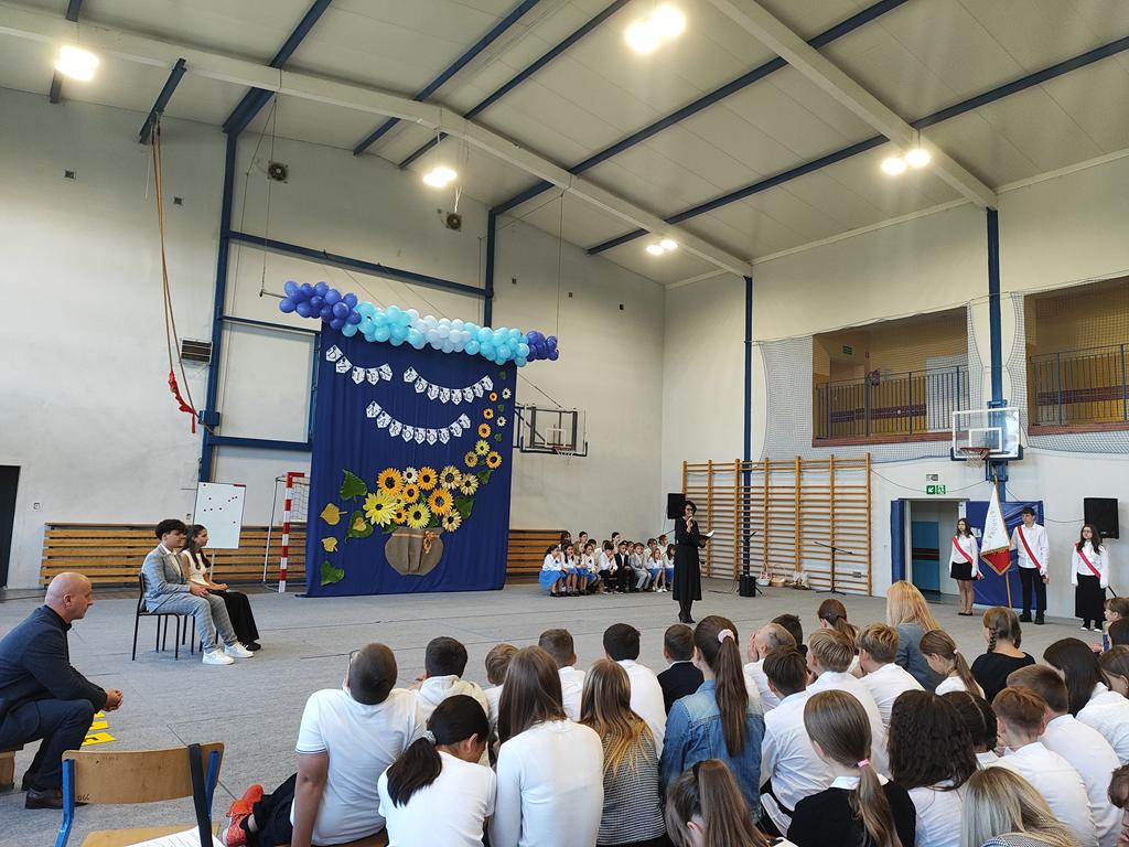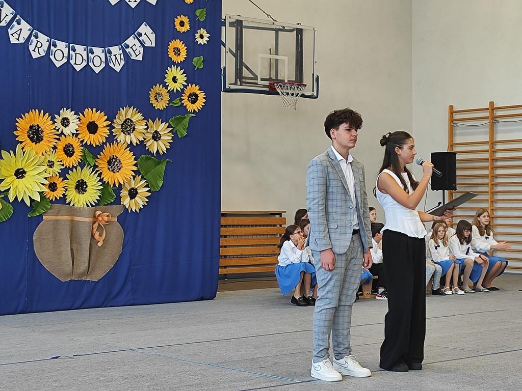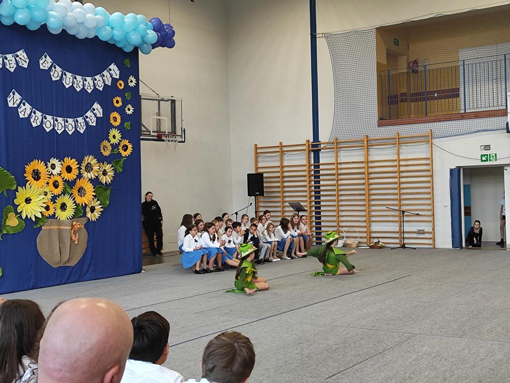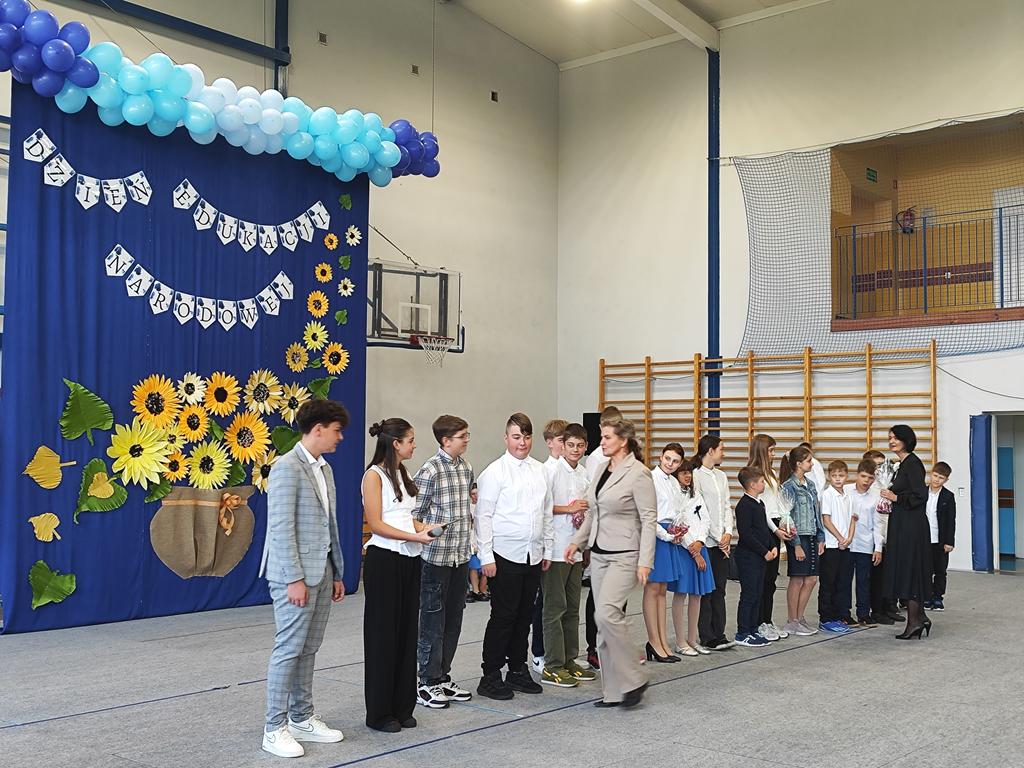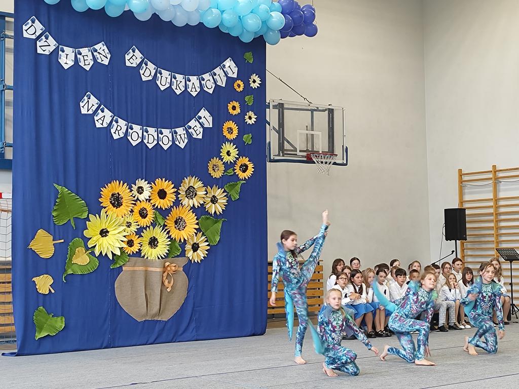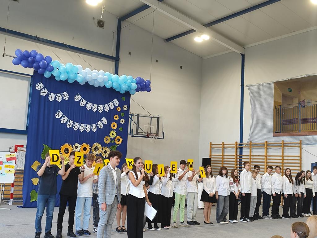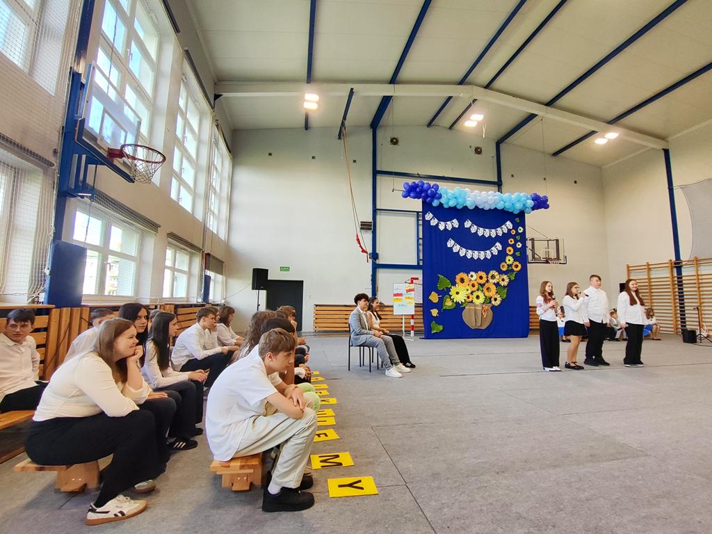 Z okazji Dnia Edukacji Narodowej uczniowie klasy 8a przygotowali wyjątkowy apel dla nauczycieli, pracowników szkoły oraz uczniów klas IV–VIII. Uroczystość rozpoczęła Pani Dyrektor Grażyna Leydy, która serdecznie powitała wszystkich zgromadzonych i skierowała ciepłe słowa do grona pedagogicznego oraz pracowników administracji i obsługi. Podziękowała za codzienny trud, cierpliwość, serce oraz zaangażowanie wkładane w wychowanie i edukację młodego pokolenia.