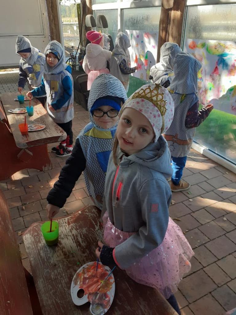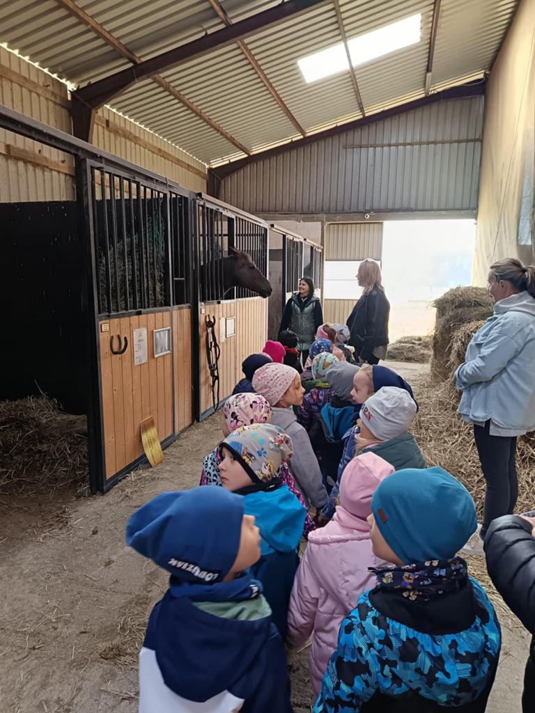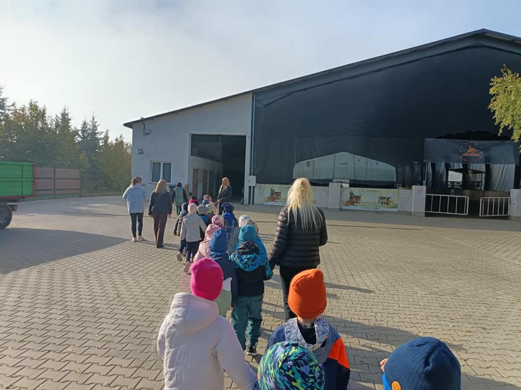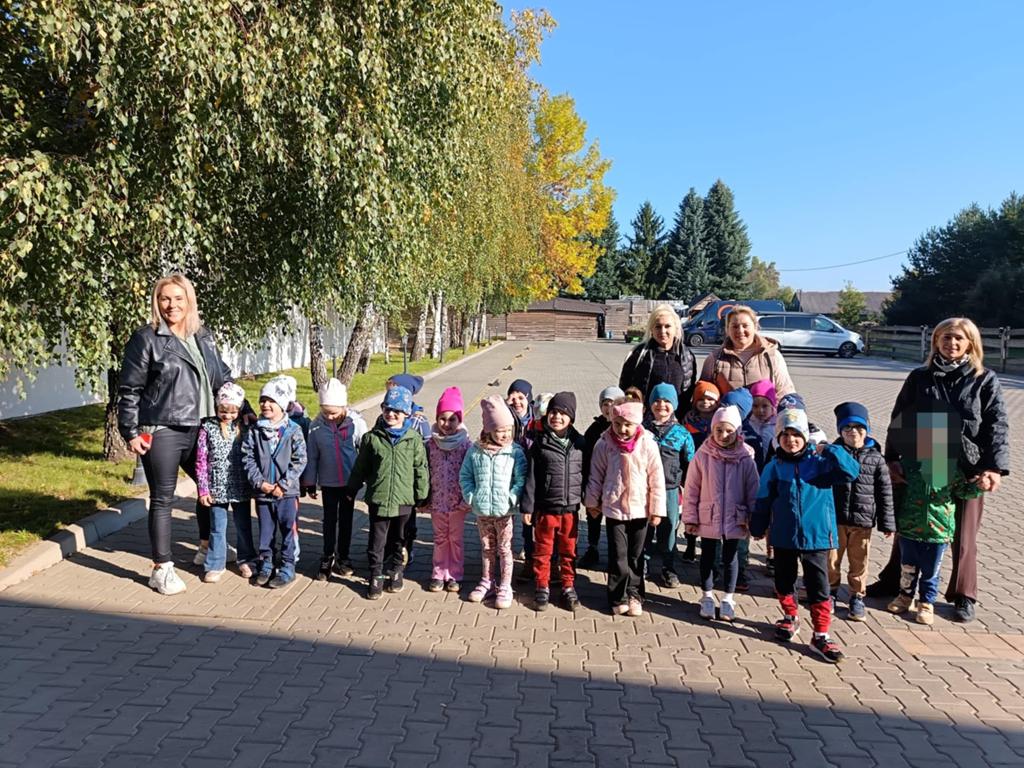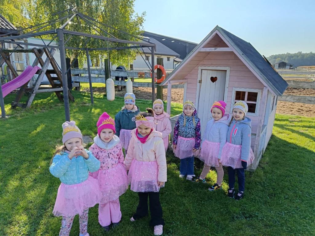 8 października dzieci z grupy „Smerfy” wybrały się na wycieczkę do stadniny koni w Podsuszu. Już od samego rana przedszkolaki z wielkim podekscytowaniem wyruszyły w drogę, by spotkać się z pięknymi końmi i odkryć ich niezwykły świat. Na miejscu czekało na dzieci wiele atrakcji. Podczas spaceru po stadninie mogły z bliska zobaczyć konie, dowiedzieć się, czym się żywią i jak należy o nie dbać. Największą radość sprawiła jazda konna na koniu o imieniu Magnum – każde dziecko mogło spróbować swoich sił pod czujnym okiem instruktora. Tego dnia przedszkolaki wcieliły się również w role księżniczek i rycerzy – dziewczynki w pięknych koronach, a chłopcy z dzielnymi tarczami wyruszyli na „dworską przygodę”. W bajkowej atmosferze uczestniczyły w zabawach ruchowych i tematycznych, które pozwoliły im przenieść się w świat fantazji. Pobyt w stadninie był nie tylko pełen radości, ale także okazją do nauki odpowiedzialności, empatii i szacunku do zwierząt.